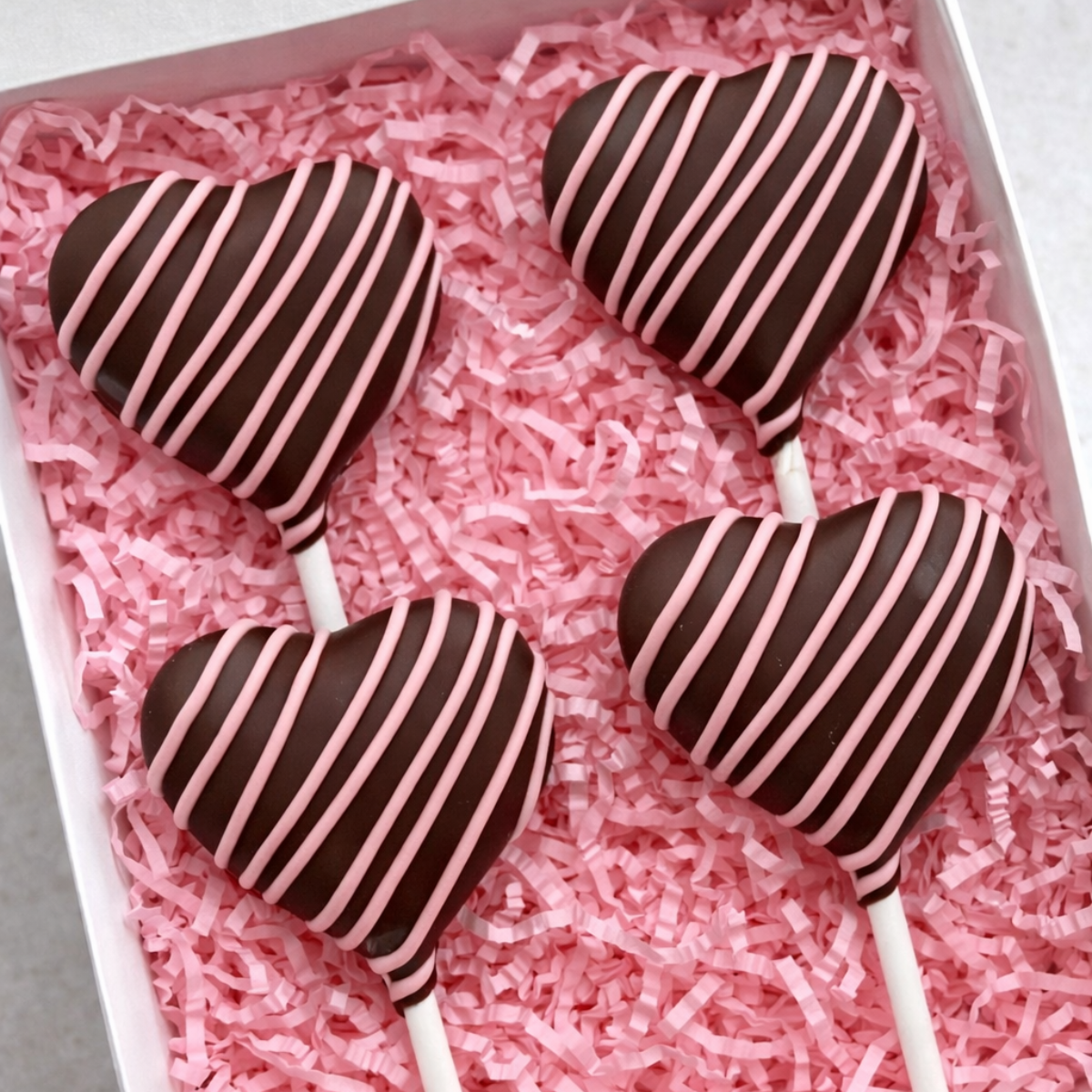 Delicious Chocolate Cakepop mixed with chocolate buttercream and chocolate sprinkles, dipped in dark chocolate with pink chocolate drizzle. | Allergens: Dairy · Egg · Soy | Best served cold. Four (4) cakepops included per box.