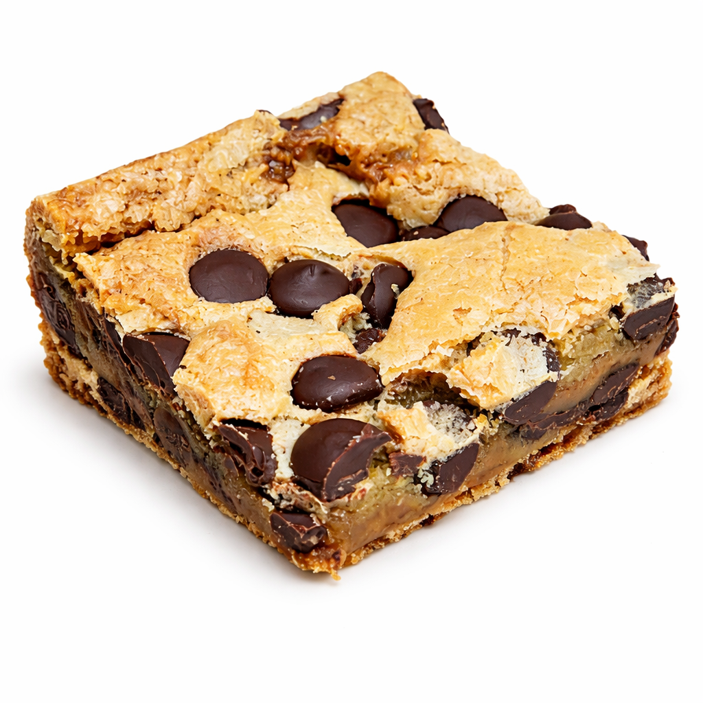GLUTEN FREE SALTED CARAMEL BAR | Delicious Chocolate Chip Blondie Filled w/ Creamy Caramel Topped Off w/ Rare Nordic Sea Salt | Allergens: Dairy · Egg · Soy | Best Served @ Room Temperature