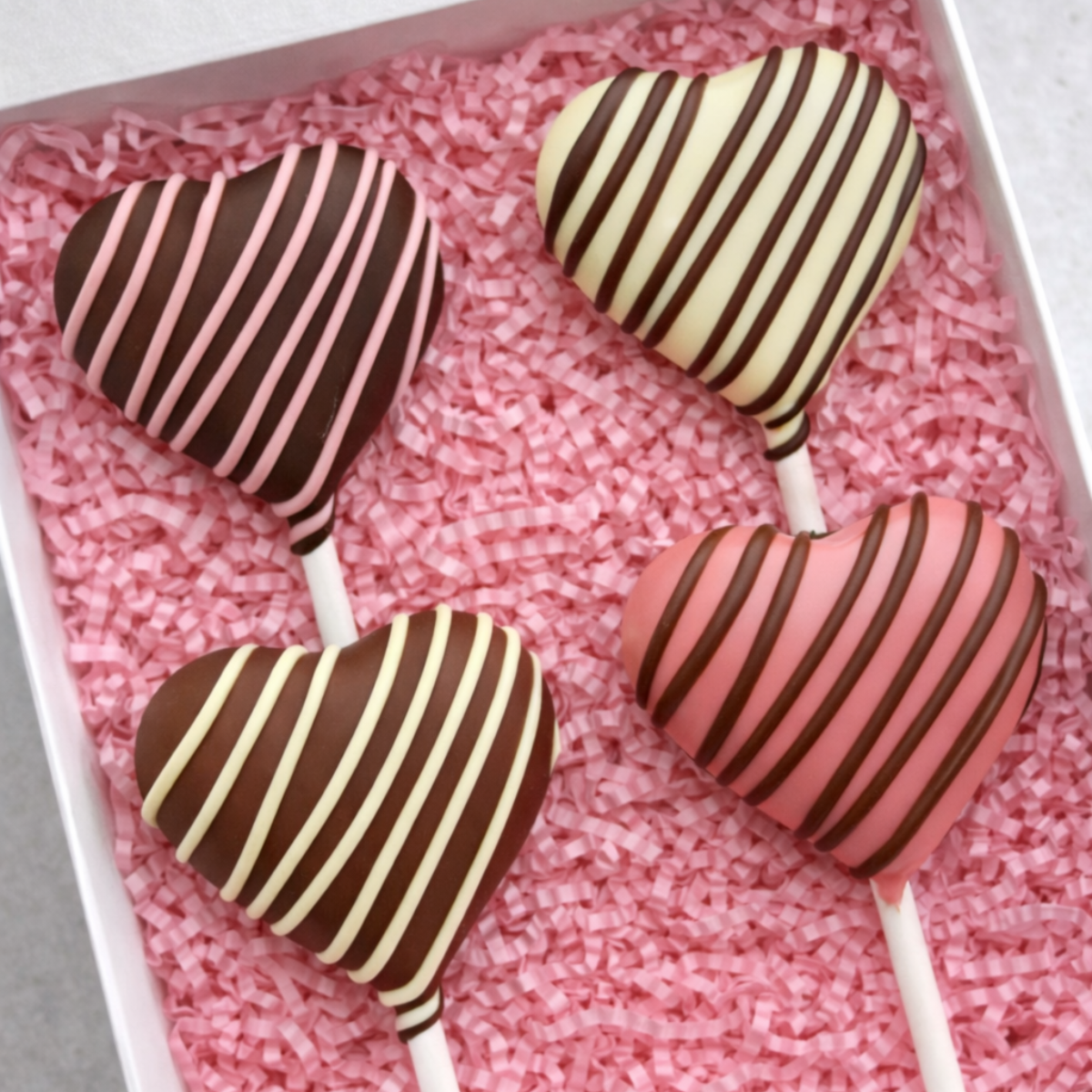 One of Each Chocolate Heart Cakepops | Allergens: Dairy · Egg·| Best Served Cold | Four (4) cakepops included per box.